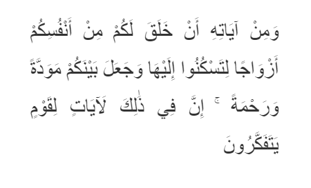 “Dan di antara tanda-tanda kekuasaan-Nya ialah dia menciptakan untukmu isteri-isteri dari jenismu sendiri, supaya kamu cenderung dan merasa tenteram kepadanya, dan dijadikan-Nya diantaramu mawaddah dan rahmah. Sesungguhnya pada yang demikian itu benar-benar terdapat tanda-tanda bagi kaum yang berfikir.”